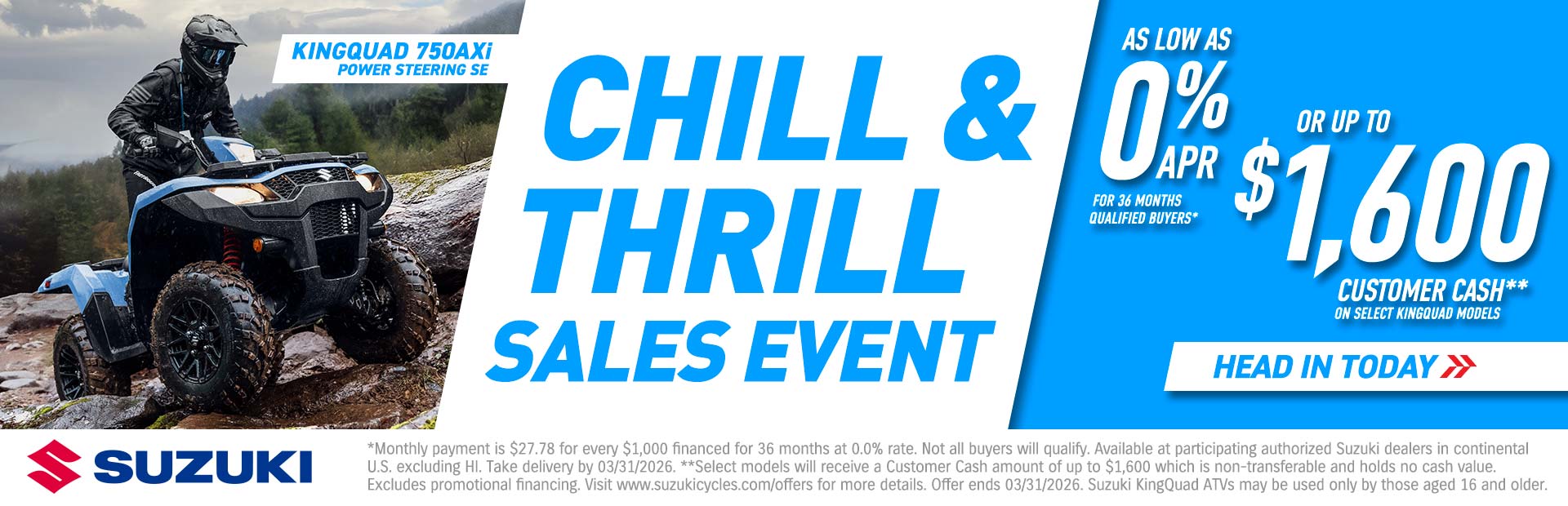 Select new and unregistered models will receive Customer Cash amount of up to $2,000, depending on model. Customer Cash is non-transferable and holds no cash value in the continental United States excluding HI. Visit www.suzukicycles.com/offers to see which select models qualify for customer cash. Excludes promotional financing. All Offers on 2023 models expire 03/13/2026. Offers subject to change without notice. Effective from a participating authorized Suzuki dealer between 01/01/2026 and 03/31/2026.